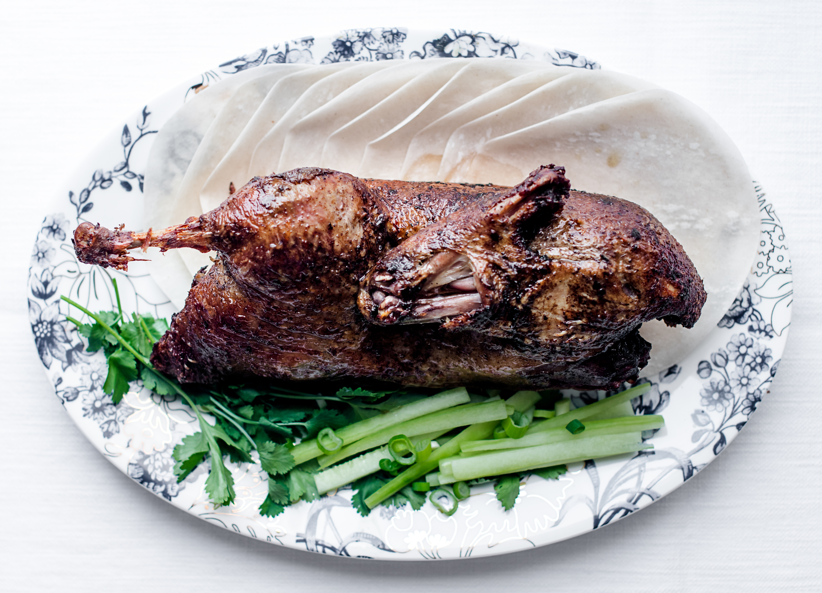 We've taken our ever popular Half Free Range Yorkshire Wolds Duck and brined it for 3 days in an authentic mix of classic Chinese flavours including Black Vinegar, Five Spice, Sichuan peppercorns, malt and light soy sauce. The Ducks are left to hang and dry for 48hrs before a low, slow and gentle dry roast followed by a steam cook for 3hrs to ensure the fat is fully rendered whilst maintaining the moisture and flavour of the meat. We've included plenty of British made Pancakes and the all important Hoisin Sauce. All that needs to be added is finely sliced fresh spring onions and batons of peeled and de-seeded Cucumber. This is probably Britain's favourite Chinese meal brought expertly and authentically to you by F&Co.